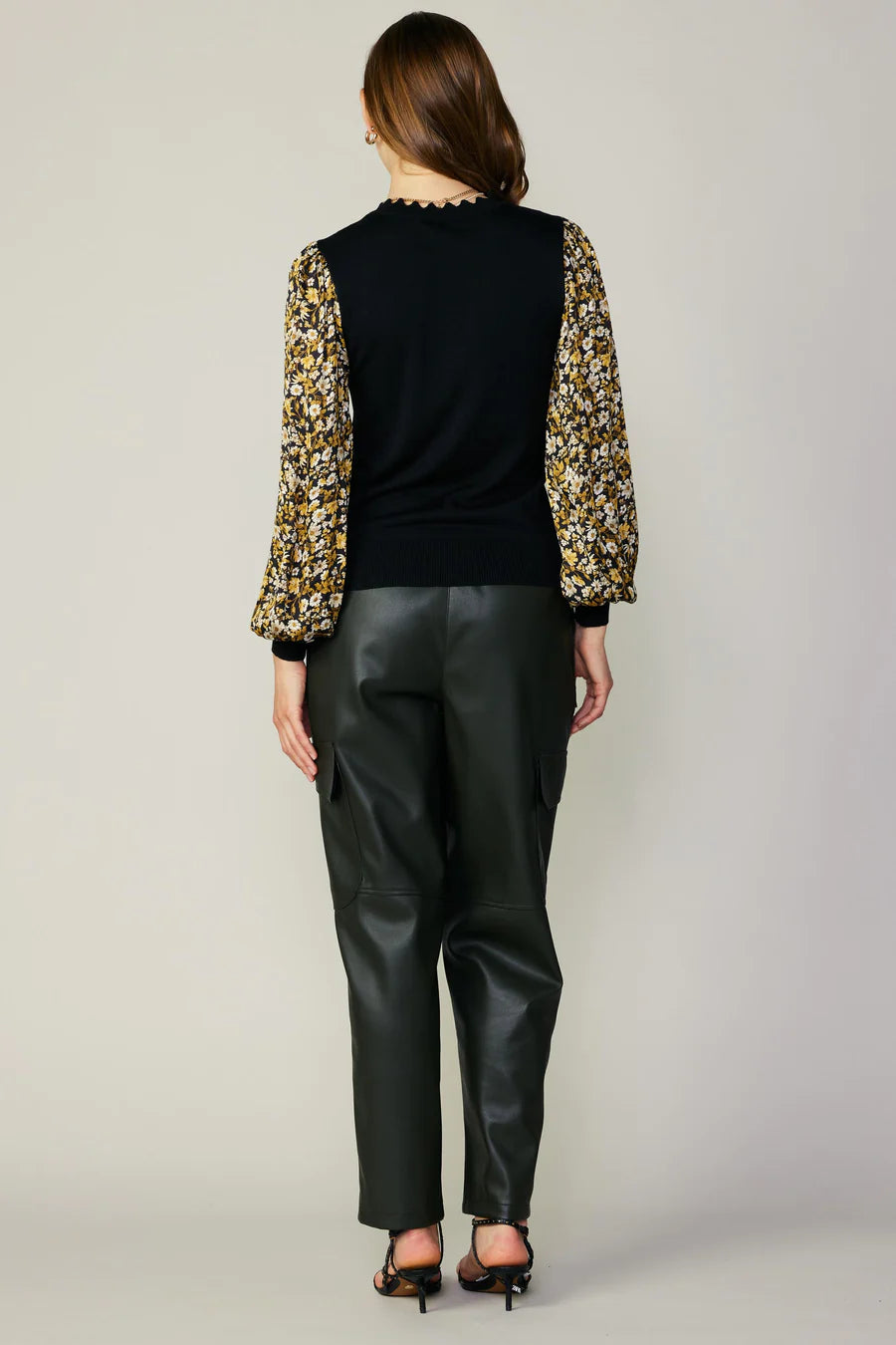 This isn't your typical sweater. The bodice is knitted with a scalloped neckline and ribbed edges. It's contrasted by long, woven sleeves with a slightly puffed shape and a charming floral print on a black base