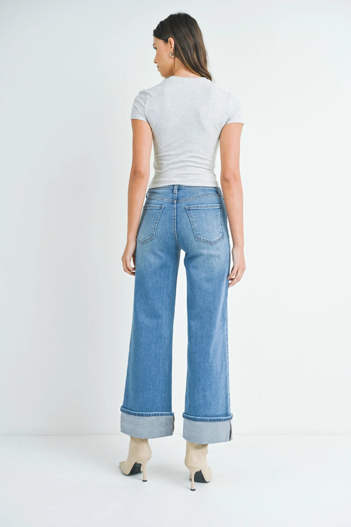 These Andrea Cuffed Palazzo Jeans feature a 10.5'' rise, 29.5'' inseam, and a 10'' opening. The medium denim material is both stylish and comfortable. The cuffed palazzo style adds a trendy touch to any outfit. Perfect for a casual day out or a night on the town.