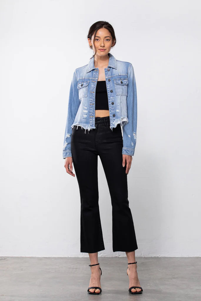 Fitted from top to bottom, this light wash cropped style includes a minimal distressing and uneven frayed hems, along with double pocket details.