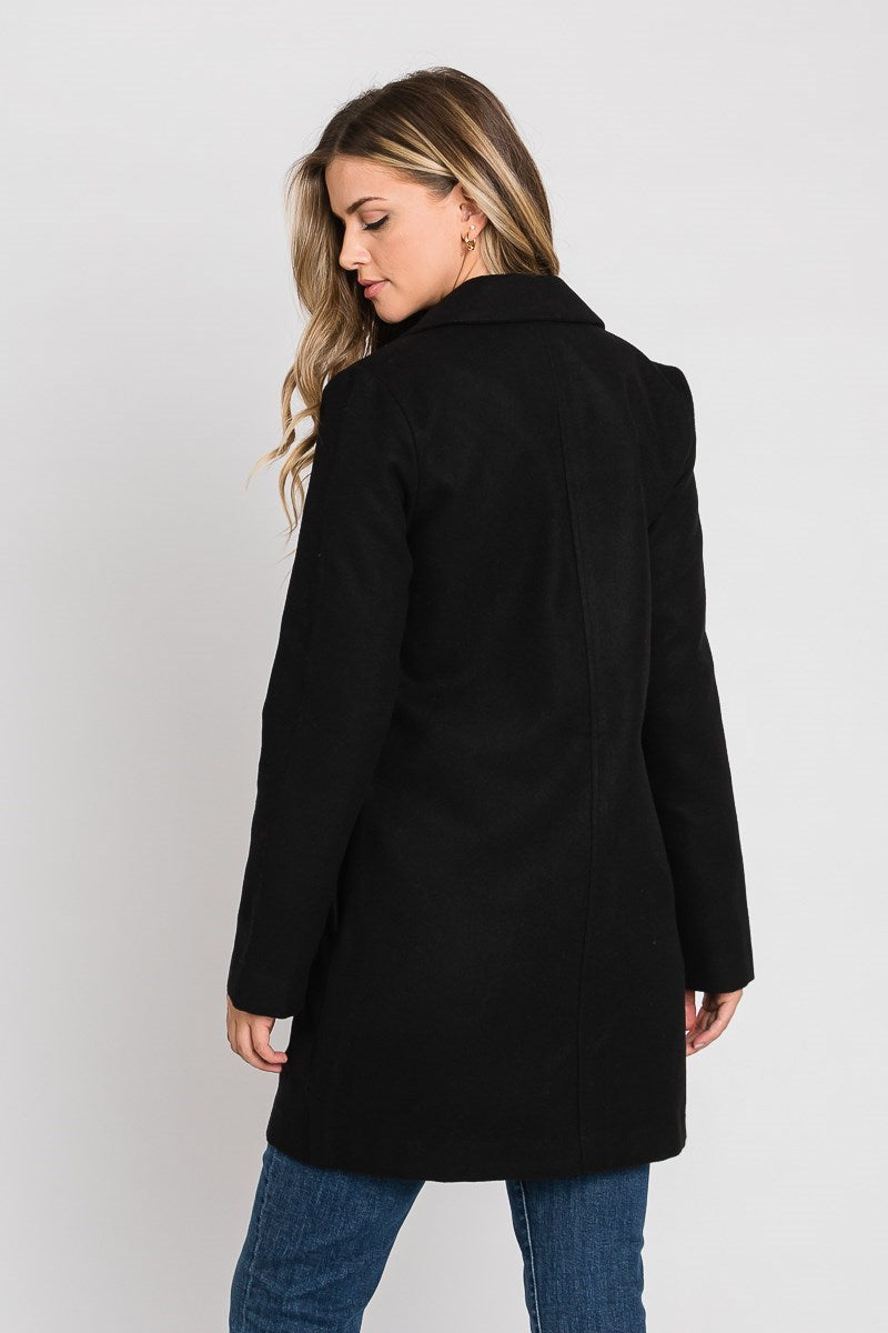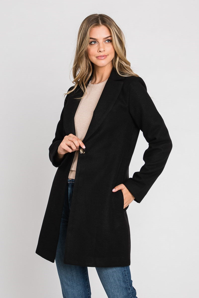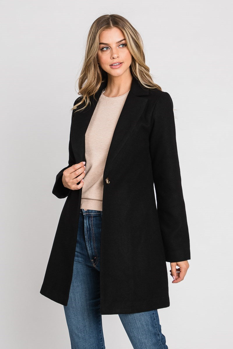 Notched collar coat with side pockets and one button that slightly clinches the waist. Solid rich colored fabric that feels like wool.