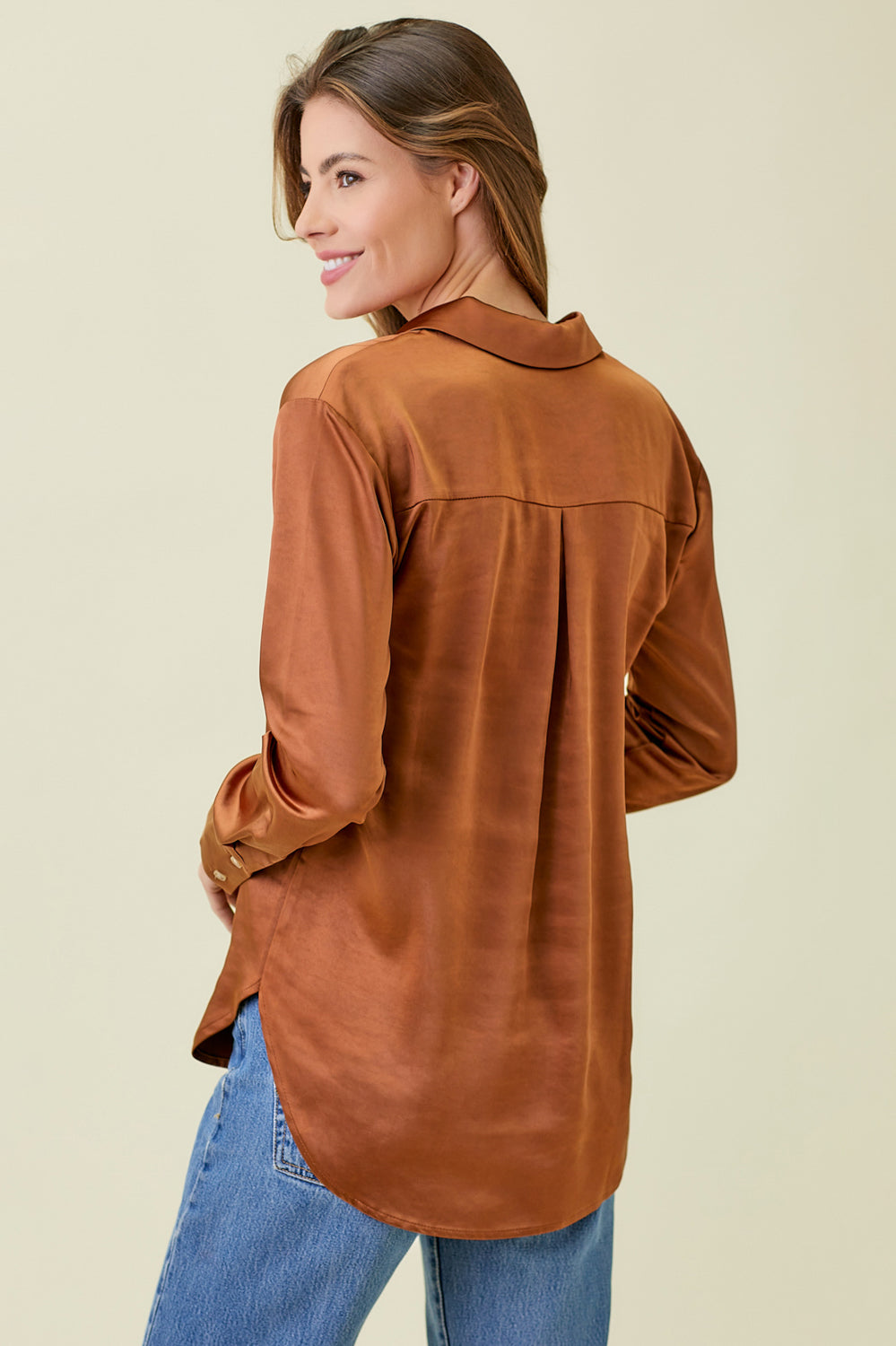 Rust colored long sleeve silky shirt, with a relaxed fit.