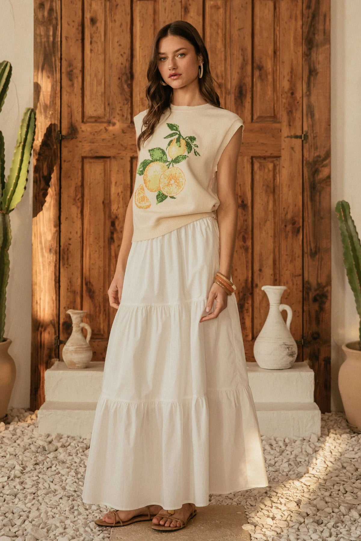 An ivory sweater top featuring an intarsia lemon design, sleeveless and ribbing along neckline and hemline.