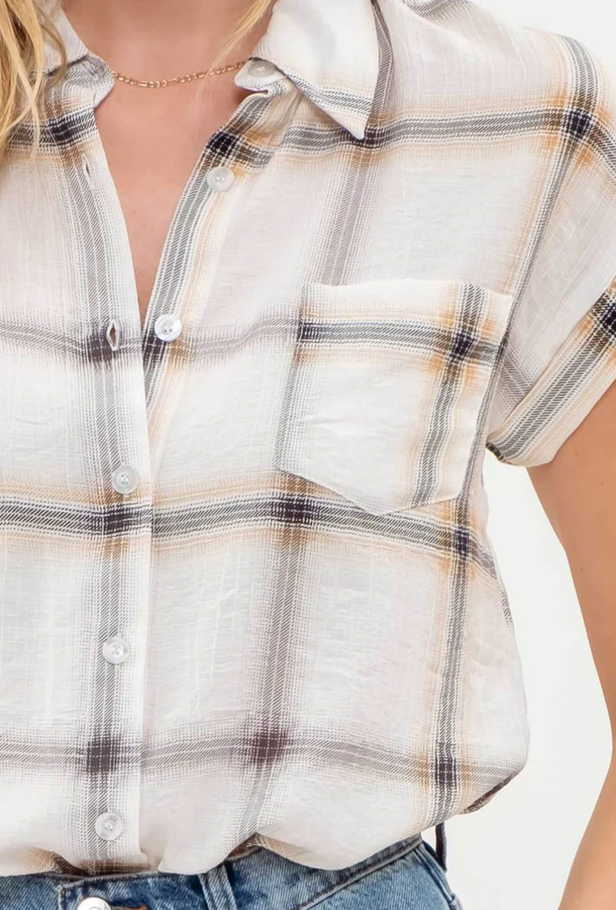 Large collard, short fold sleeve, button down pocket plaid, An easy casual top that is lightweight, comfortable and cute. True to size. NOT LINED.