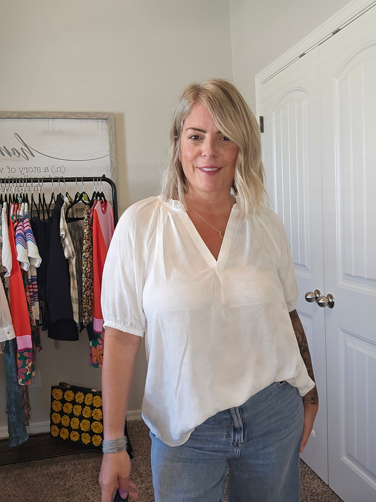 This adorable top is lightweight and versatile. Has beautiful detail throughout. Can easily be dressed down or up, or as a layering piece.